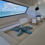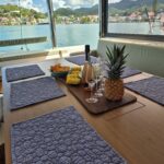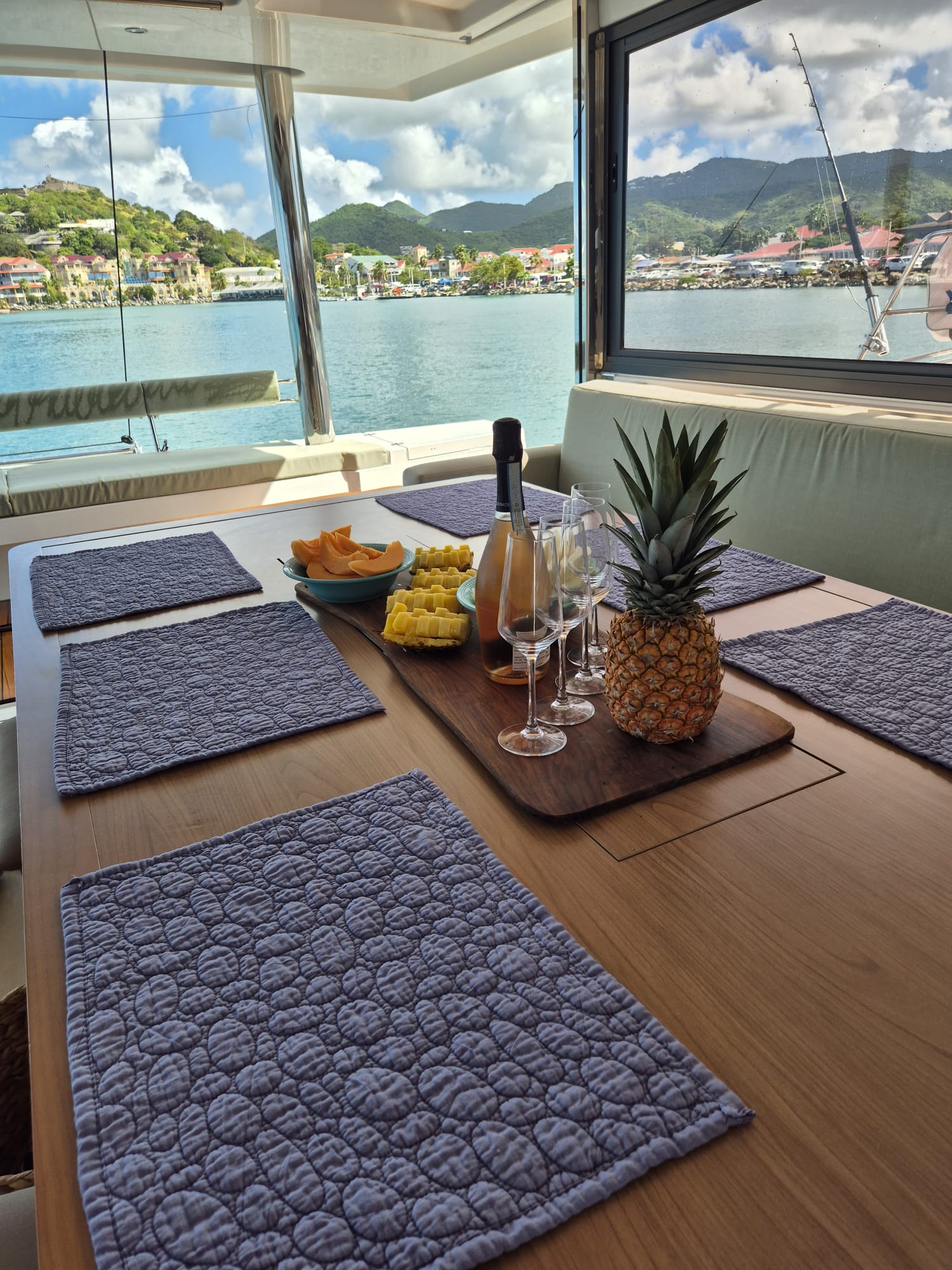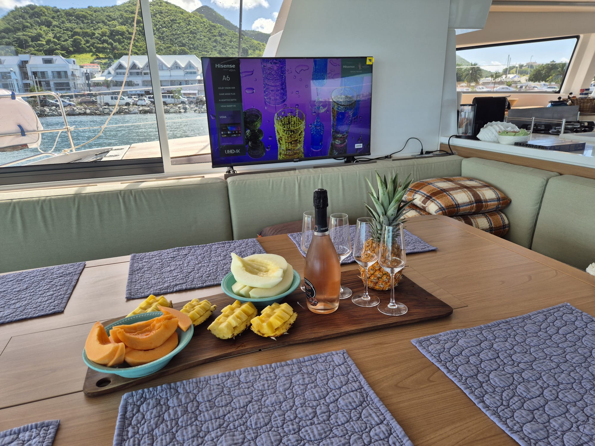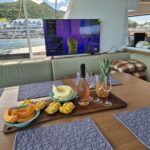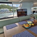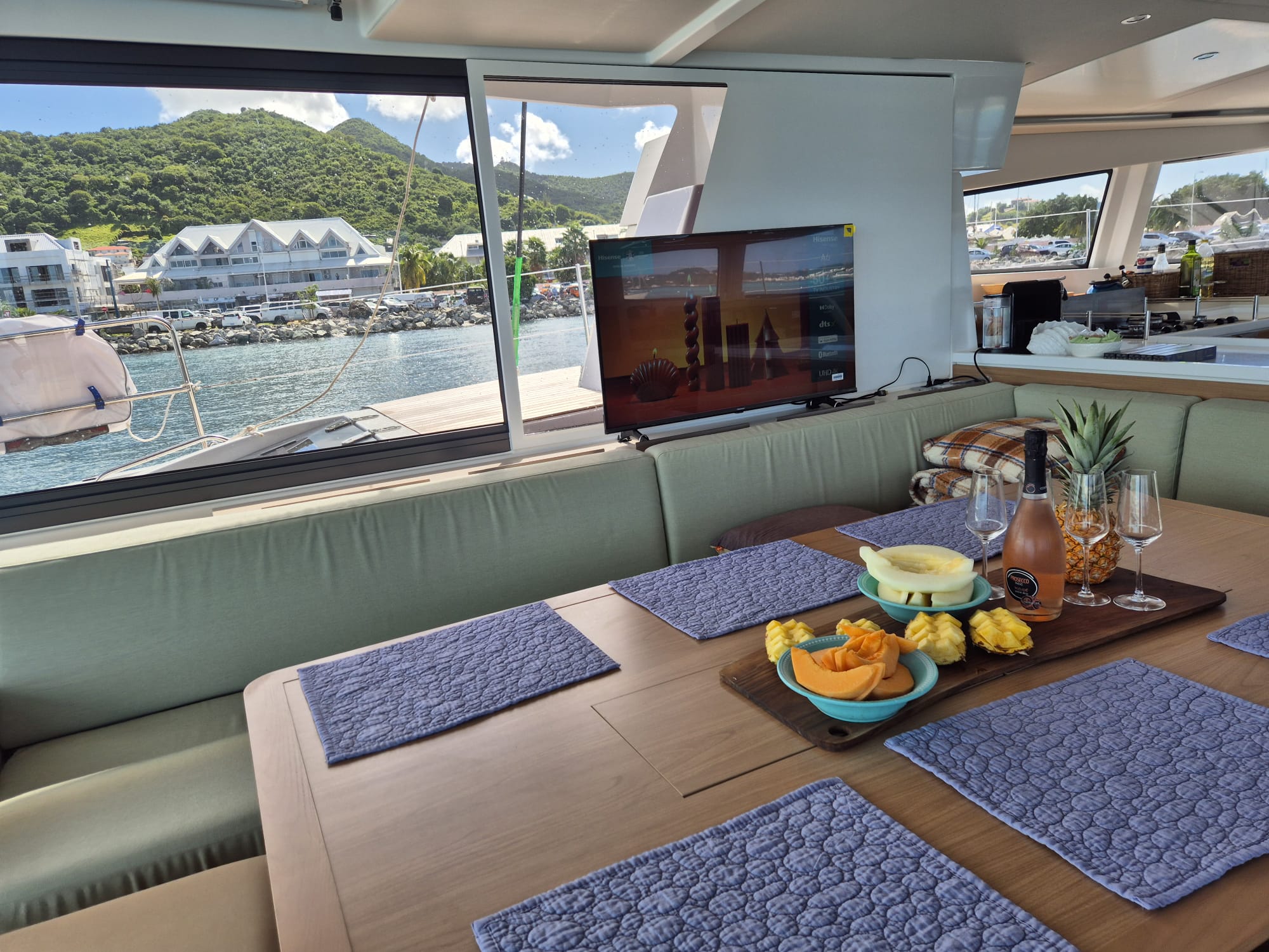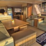 Signature forward deck without a trampoline – a hallmark of BALI catamarans. Dining area seating up to 12 guests.