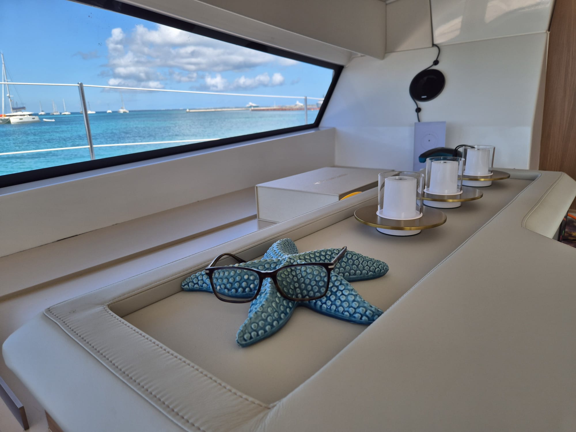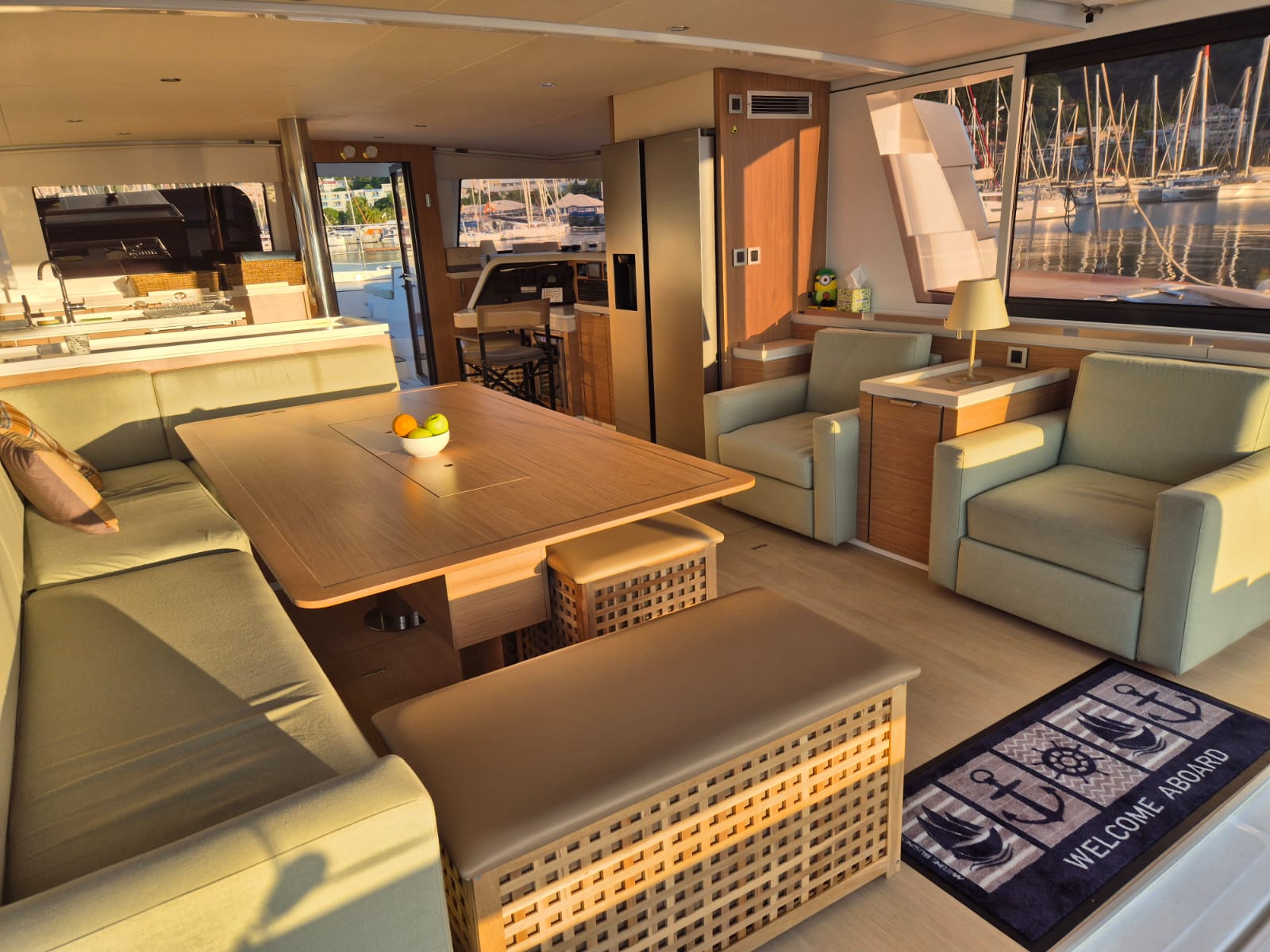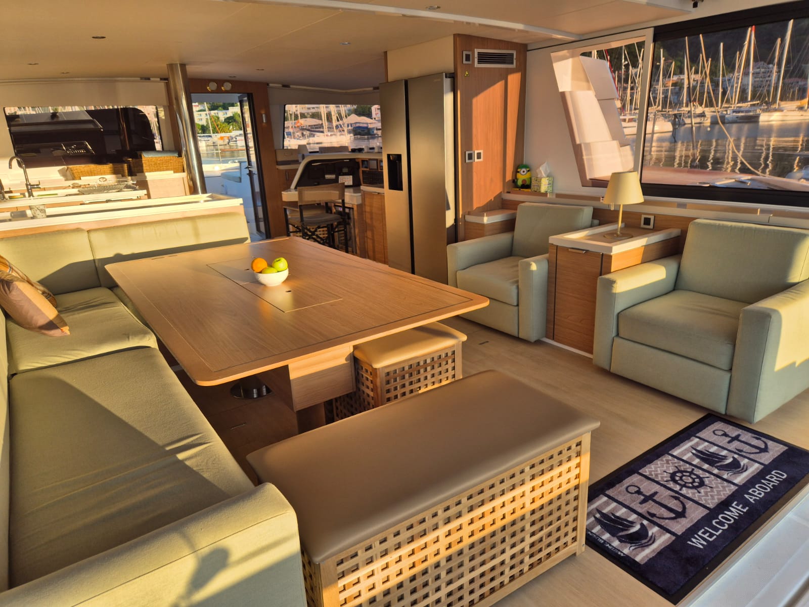 The Bali 5.4 features a vast, flush-decked saloon, galley, and aft cockpit, as well as a forward cockpit with direct access from the interior—an innovative layout that enhances space and flow.