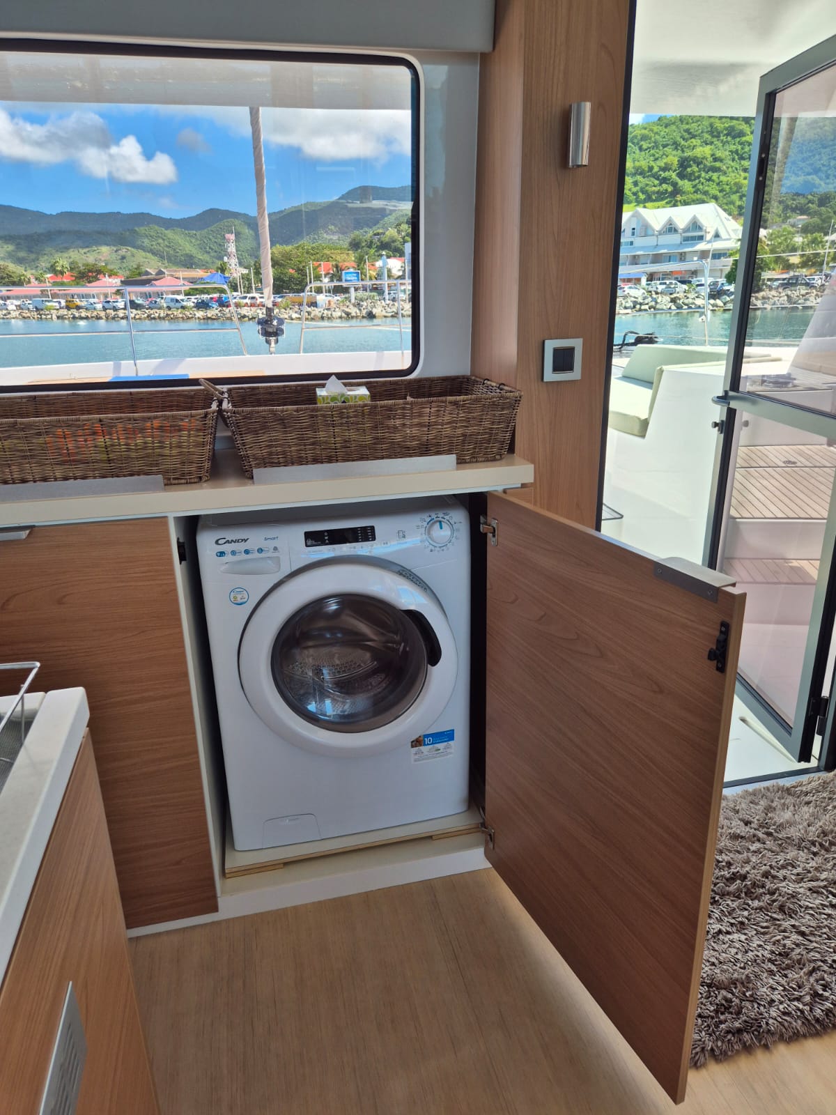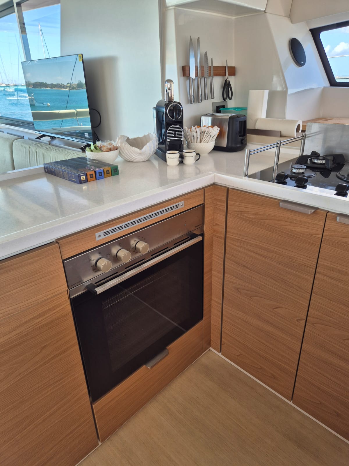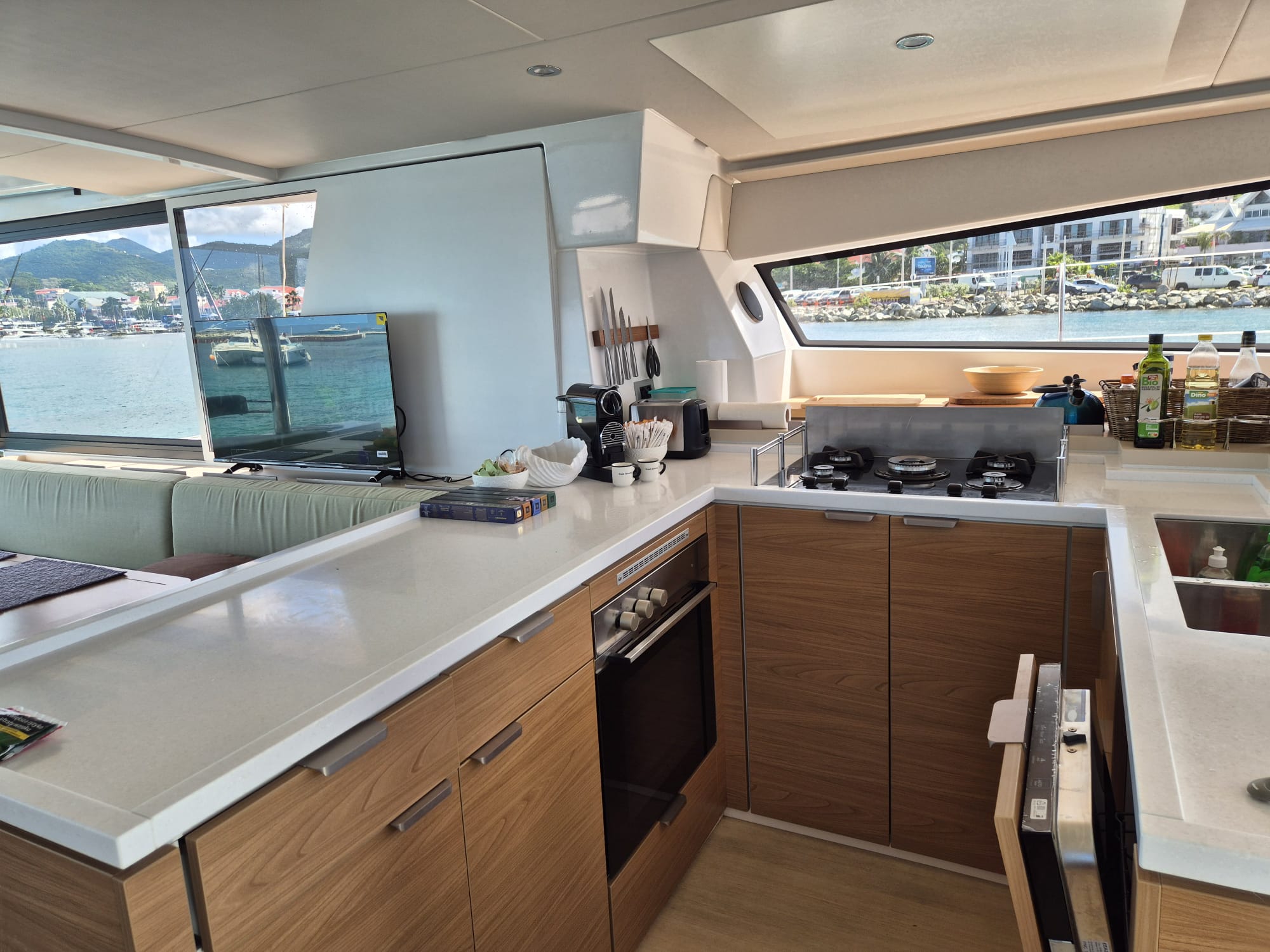 The Bali 5.4 features a vast, flush-decked saloon, galley, and aft cockpit, as well as a forward cockpit with direct access from the interior—an innovative layout that enhances space and flow.